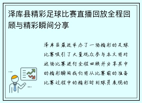 泽库县精彩足球比赛直播回放全程回顾与精彩瞬间分享